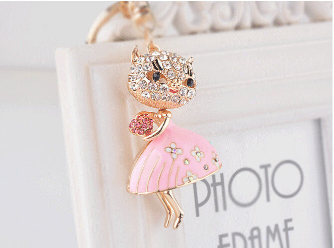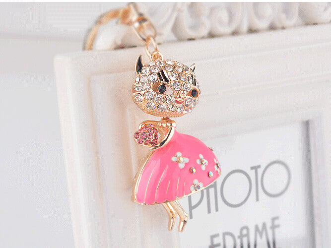 Full Rhinestone Cute Cat With Dress Keychain Key ring Charm Pendant Crystal Purse Bag Key chain Gift
